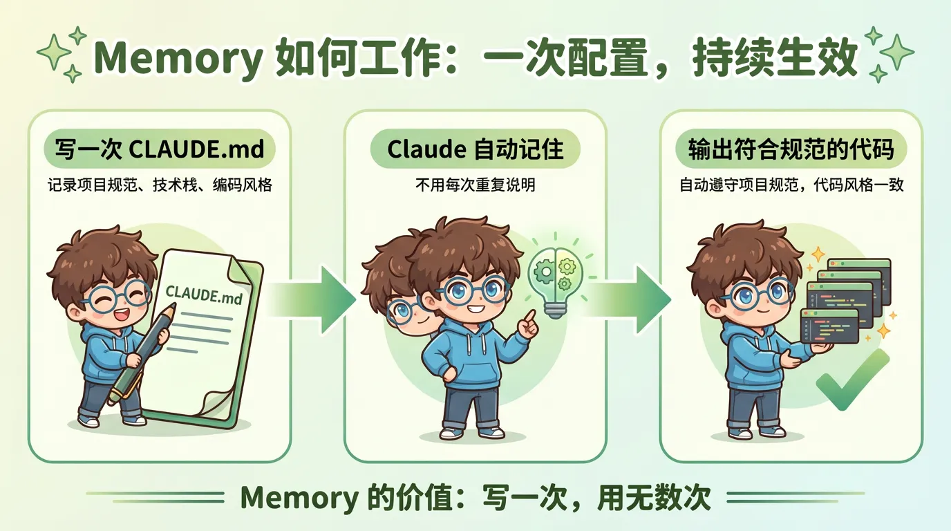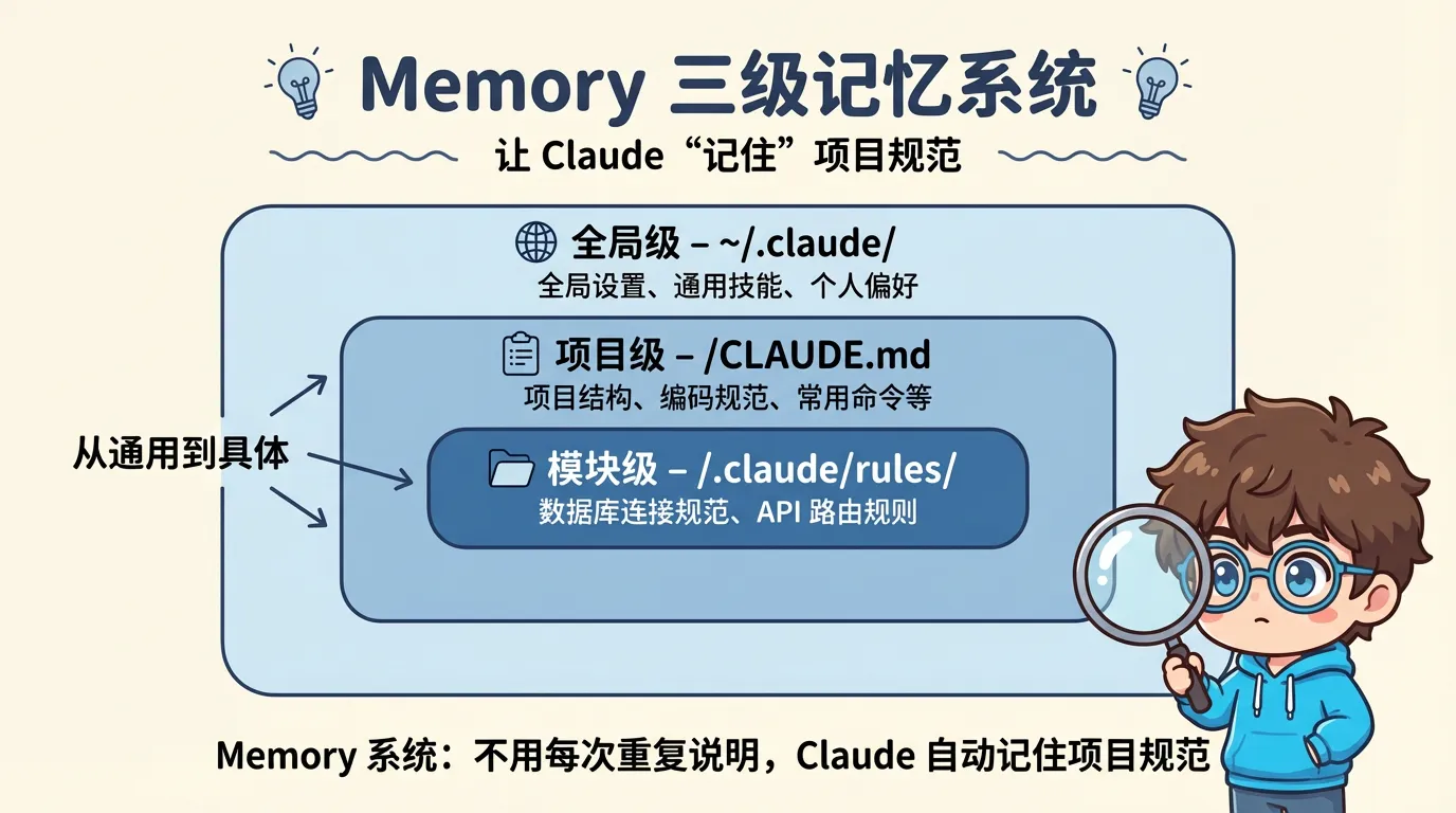 | 第1层 | Memory(记忆系统) | 让Claude记住项目规范,不用每次重复说明 |