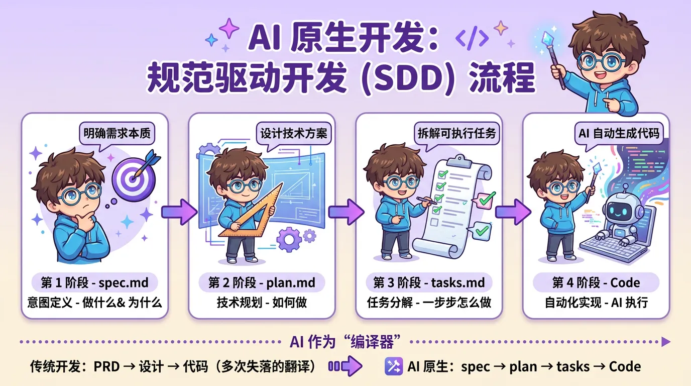 SDD 的核心不是"写更多文档",而是让 AI 在每一步都清楚地知道"为什么这样做",而不是只知道"做什么"。