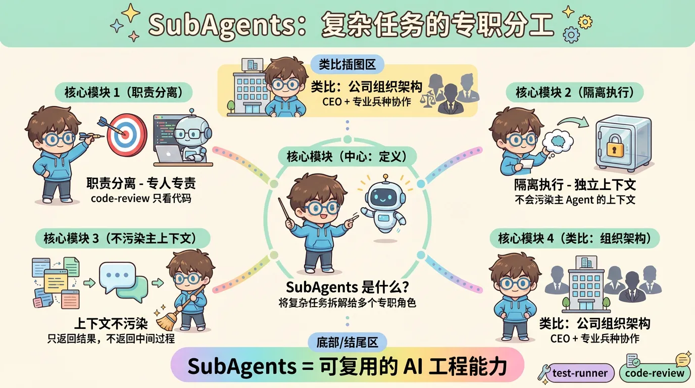 | 职责分离 | 每个SubAgent专注一件事,code-review只看代码,test-runner只跑测试 |