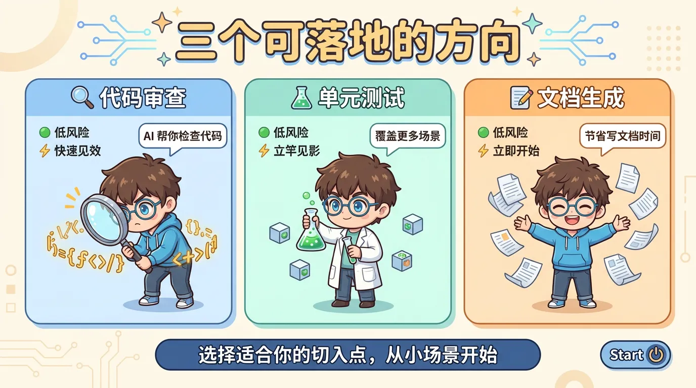 不要一开始就用在生产环境。从自动化测试、代码审查、文档生成这些日常环节入手,先验证 AI 协作的可行性。