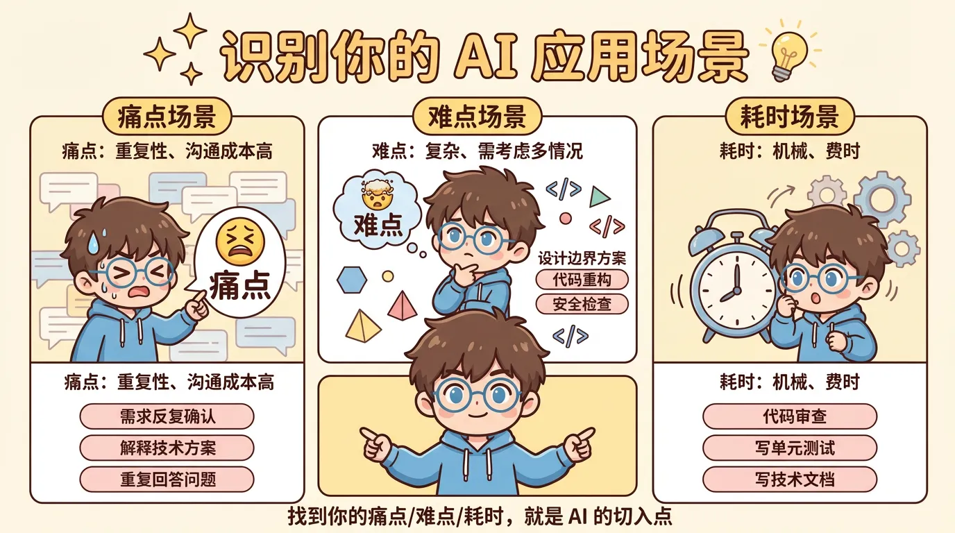 找到你的痛点、难点、耗时点,就是 AI 的切入点。不是所有事情都需要 AI,但每个领域都有一个值得用 AI 的环节。